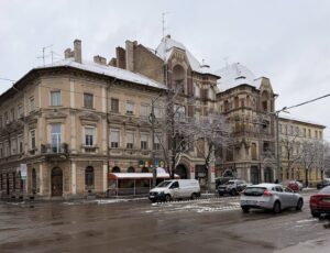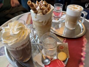 We all assembled early ready to walk into town for some breakfast. The route into town was very beautiful with snow covered trees set against a backdrop of interesting architecture.