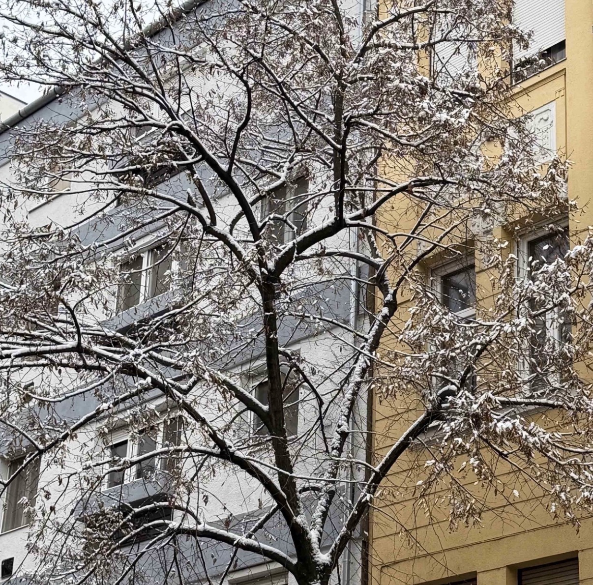 on our first day we were met by a beautiful snowy scene. I opened my bedroom shutters and I was greeted by snow covered buildings.